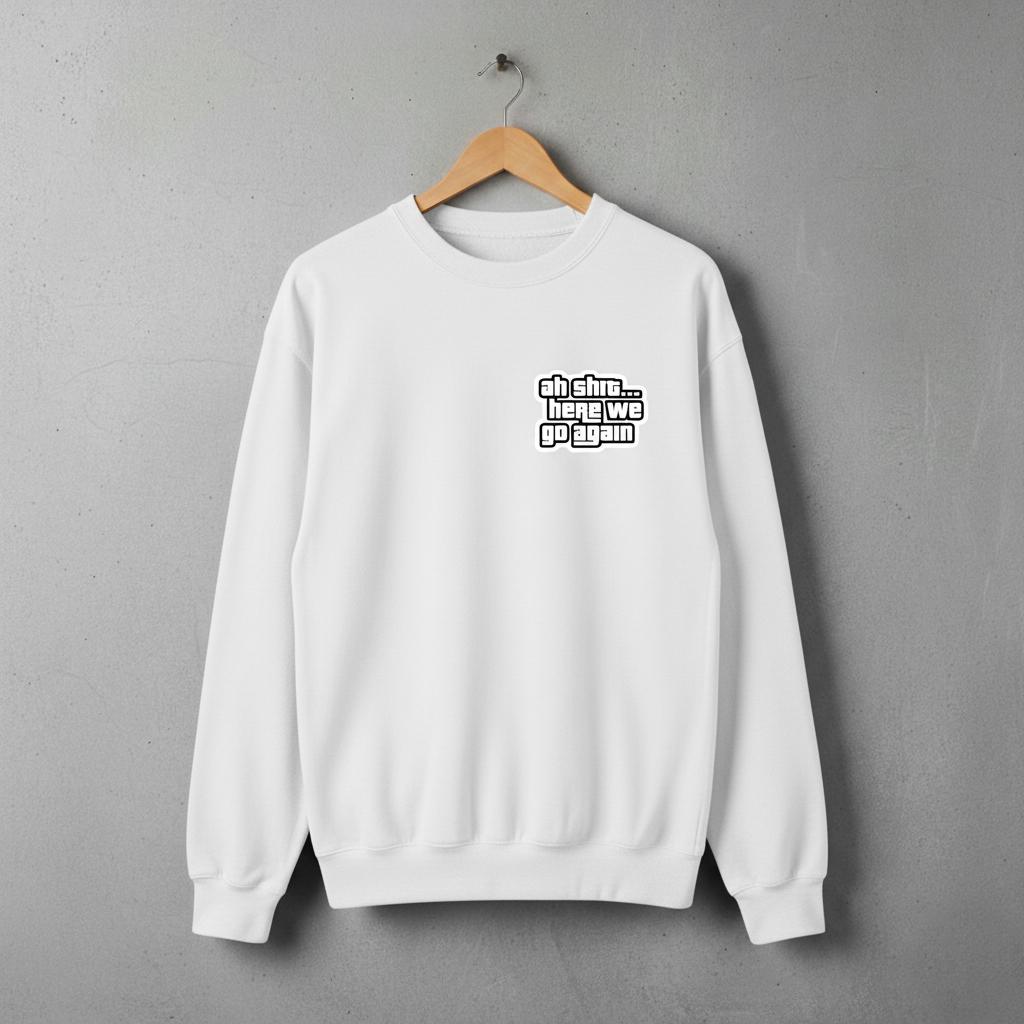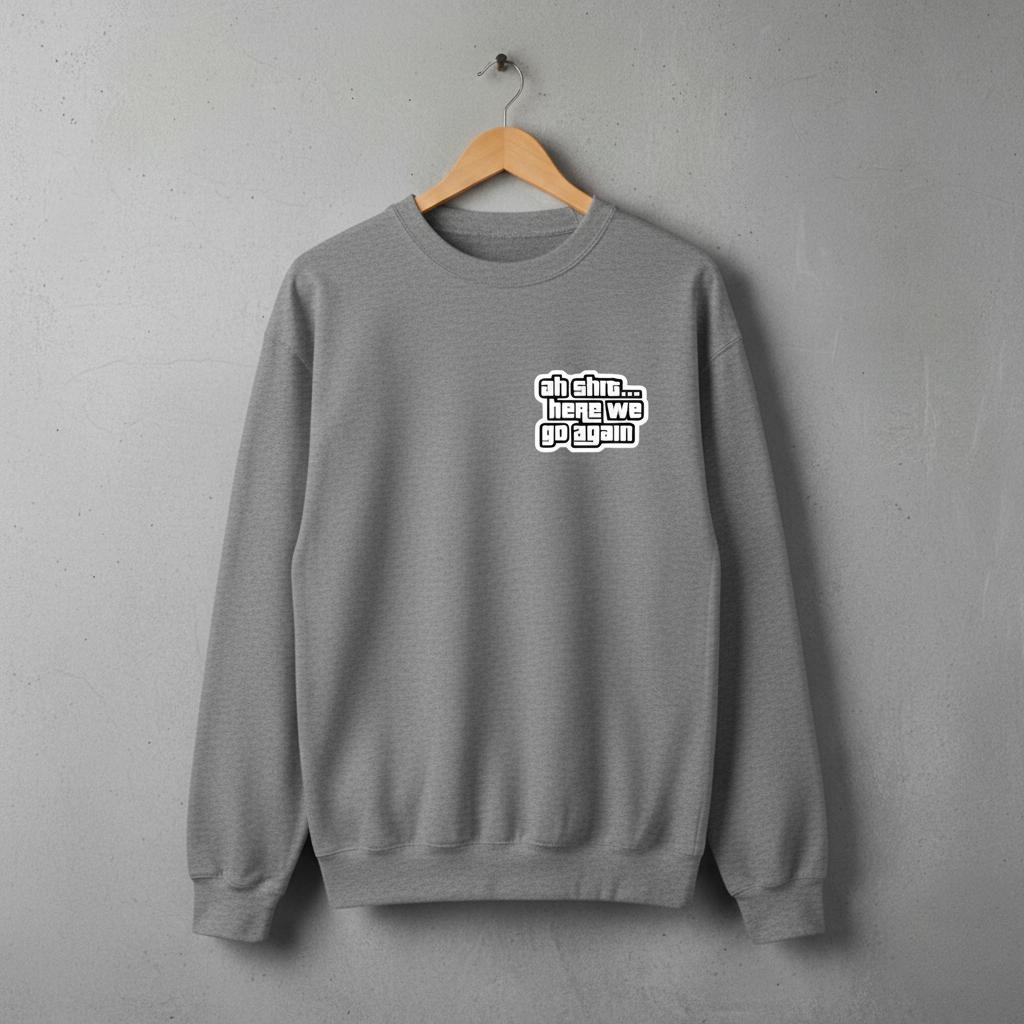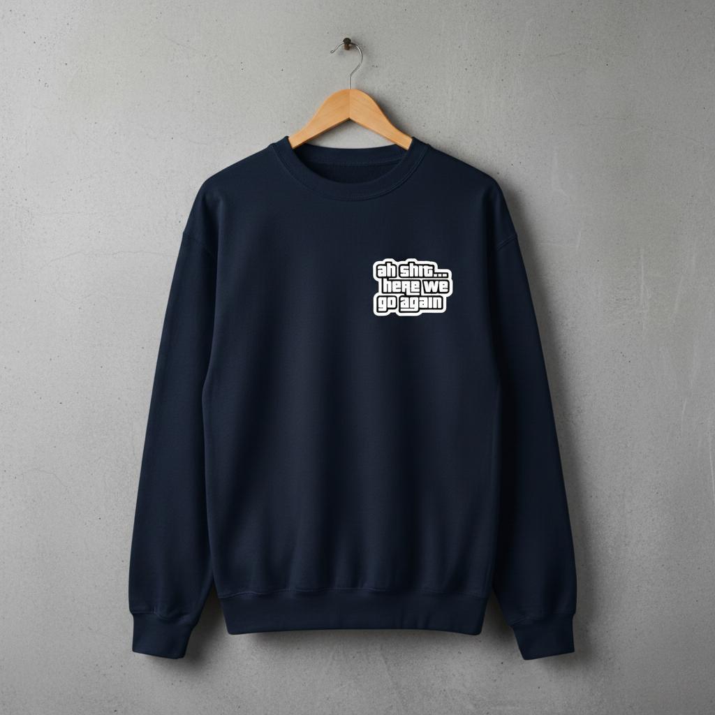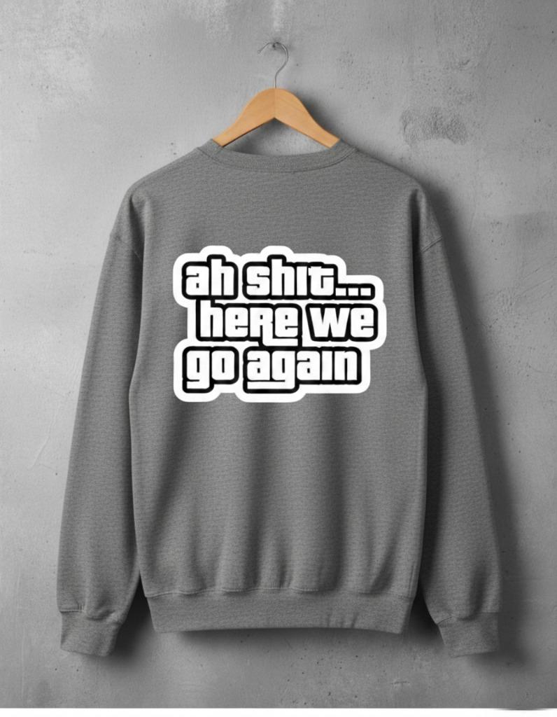 Relive one of the most memorable moments in gaming history every time you pull on this cozy crewneck. Featuring the legendary line "Ah shit... here we go again" in a bold, recognizable font inspired by the classic video game, this sweatshirt is a must-have for any gamer or anyone who appreciates a touch of nostalgic, self-aware humor.