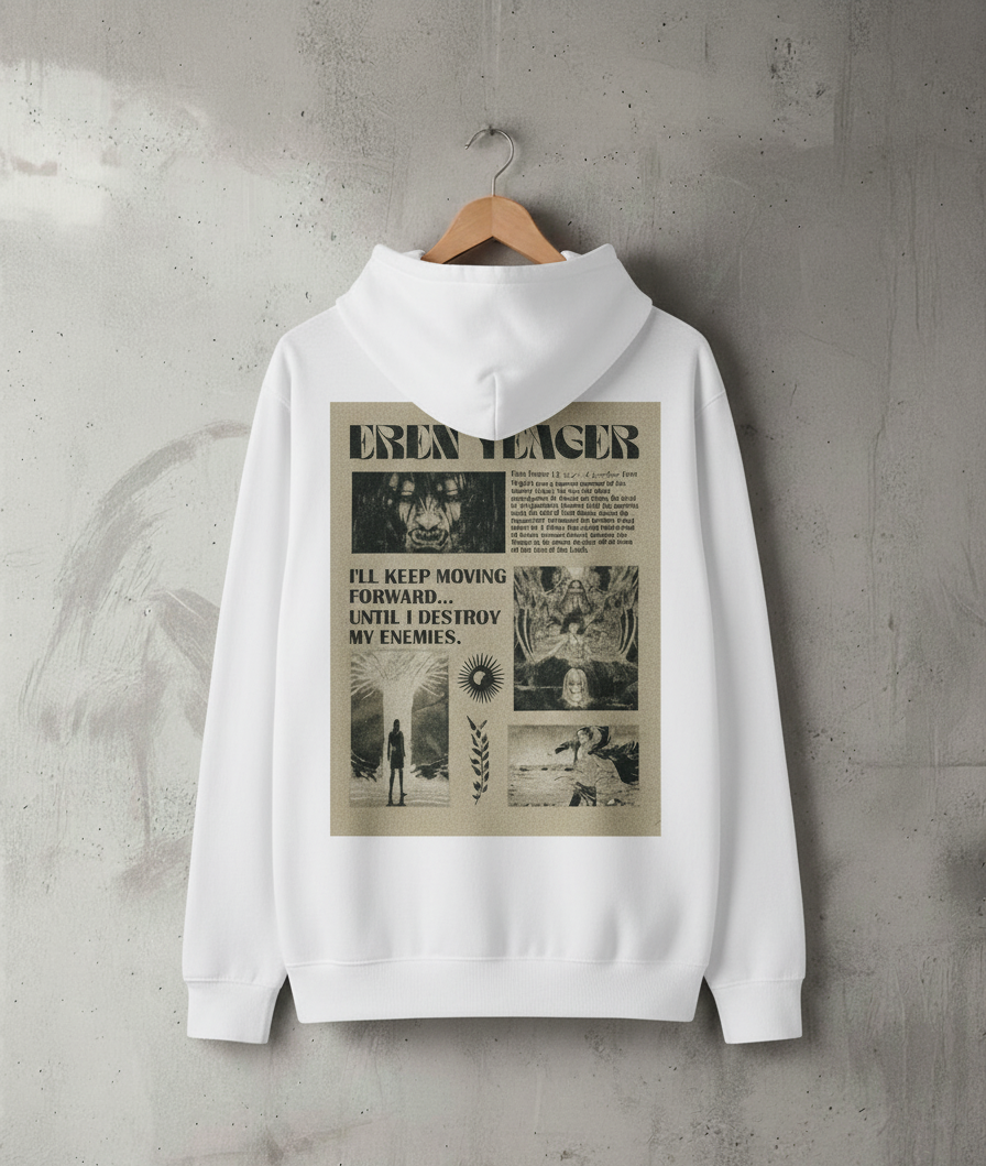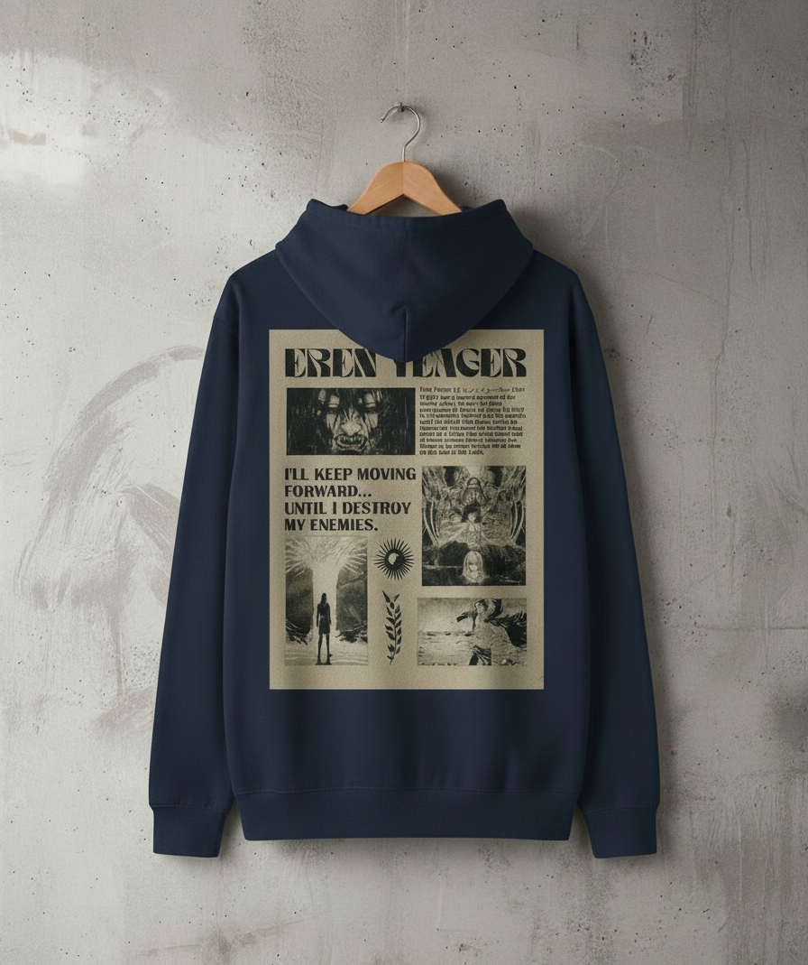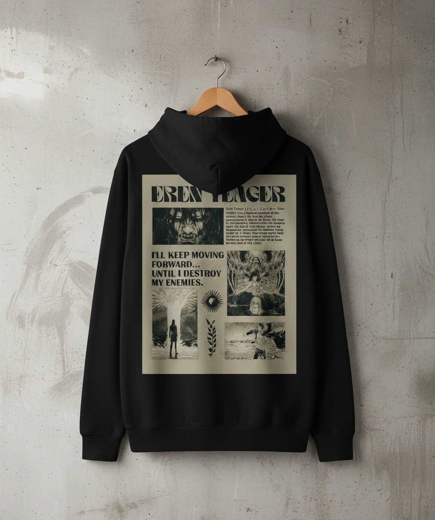 The back features a high-precision screen print inspired by Eren Yeager’s journey — raw, emotional, and unyielding.
